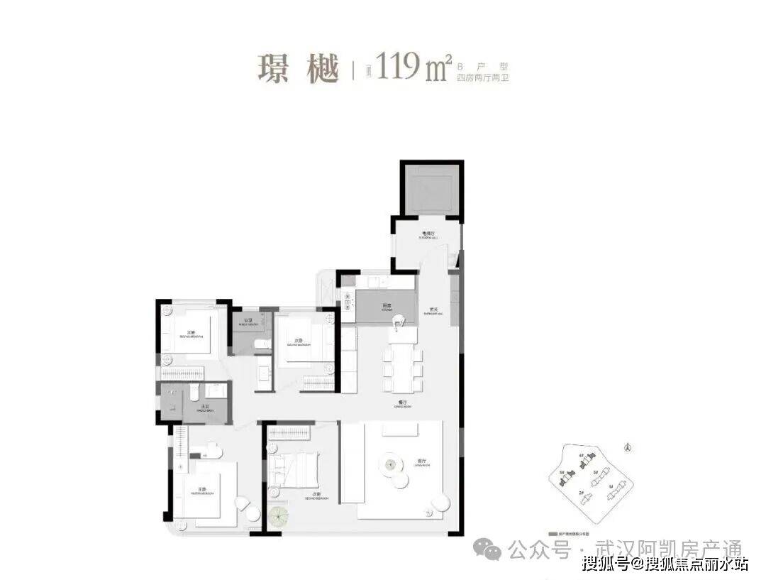 建面约119平的边套则做成标准四房+大横厅,足以秒杀周边建面约140平传统户型。
